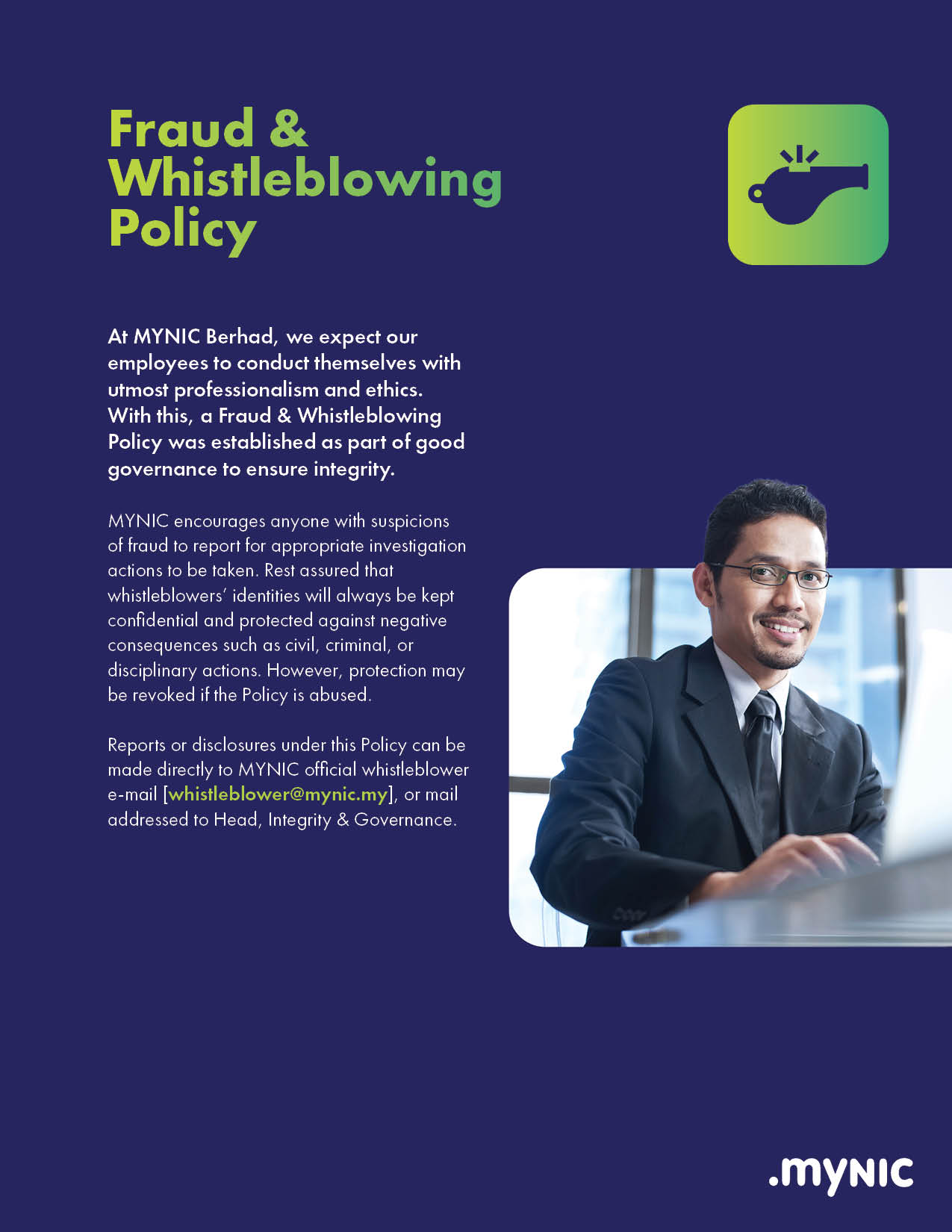 MYNIC aims to be a world-class TLD Registry in promoting .MY and as a catalyst for the digital economy. In achieving this vision, MYNIC is committed to conducting its business with integrity and the highest ethical standards, hence adopts a zero-tolerance approach to bribery and corruption, which is in line with the Malaysian Anti-Corruption Commission (MACC) Act 2009. Definitions of bribery and corruption shall follow those determine by the ISO 37001:2016 standard and the National Centre of Governance, Integrity, and Anti-Corruption (GIACC).MYNIC highly encourages those with reasonable beliefs on conducts that violate this Policy and/or the ABMS requirements to report such through whistleblower@mynic.my. Persons who raise genuine concerns in good faith will be protected in a manner that no punitive actions or other actions that result in negative consequences will be taken against them. The Whistleblowers Protection Act 2010 shall be applied whenever applicable.